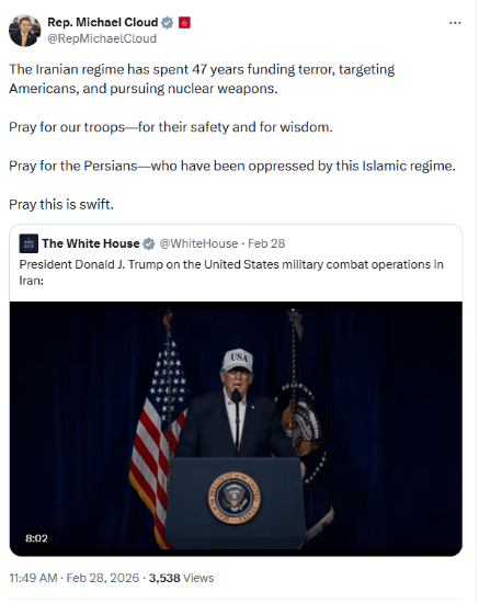 President Trump and his team have consistently stated that there is no interest in being drawn into another forever war in the Middle East. Let us pray that this conflict ends swiftly and justly while also bringing stability to the region and freedom to the Persian people.