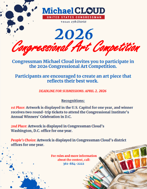 The 2026 Congressional Art Competition is now open for high school students across the Coastal Bend! This event encourages young artists to showcase their talents, and there is no set theme. Students may submit artwork on any subject of their choice.